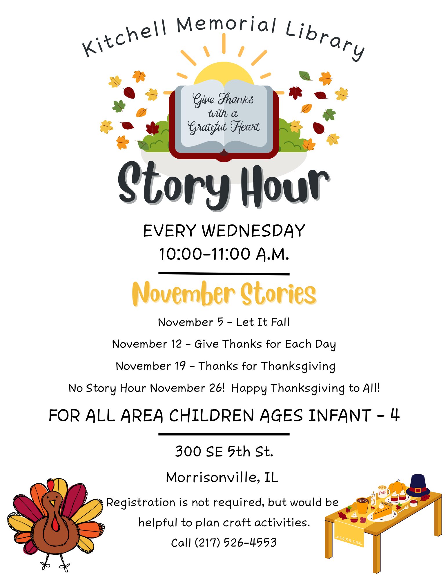 One night each November is set aside to celebrate “Family Reading Night,” a national event sponsored by the library. It encourages families to spend quality time reading together. Entertainment & refreshments are provided for all area families.